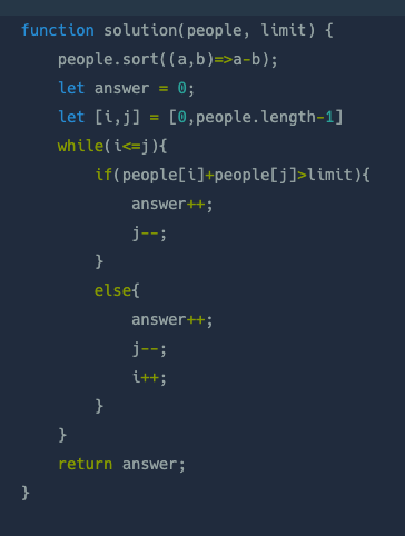 원래는 people[0]+people[i]<limit 이 되는 순간 둘로 나눴다.. 이건 대칭일때만 의미가 있는건데...