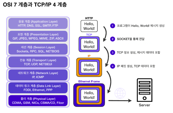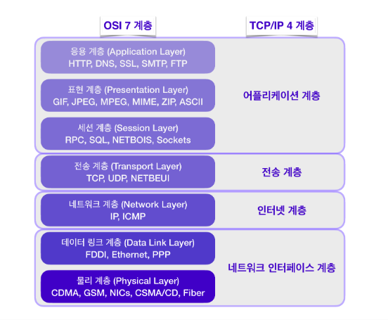 *TCP/IP 4 계층은 OSI 7 계층보다 먼저 개발되었으며 TCP/IP 프로토콜의 계층은 OSI 모델의 계층과 정확하게 일치하지는 않는다. 실제 네트워크 표준은 업계표준을 따르는 TCP/IP 계층에 가깝다.