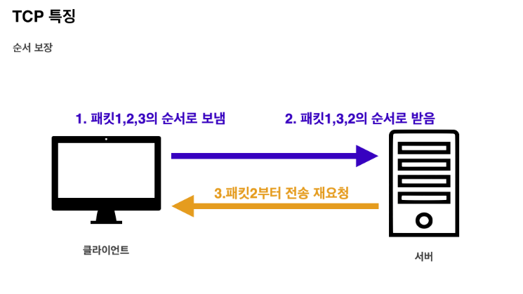 만약 패킷이 순서대로 도착하지 않는다면 TCP세그먼트에 있는 정보를 토대로 다시 패킷 전송을 요청할 수 있다.