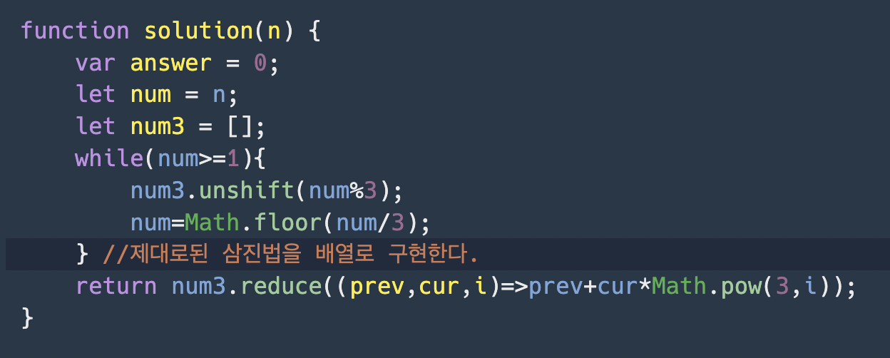 첫 while문은 삼진법 거꾸로한것 구하는 함수다 저렇게 하면 그냥 거꾸로 된 삼진법이 나온다.