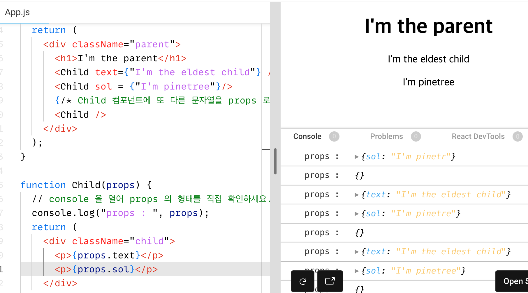 console을 보면 알 수 있듯이, props에는 {sol:"I'm pinetree"}가 객체로 저장된다.