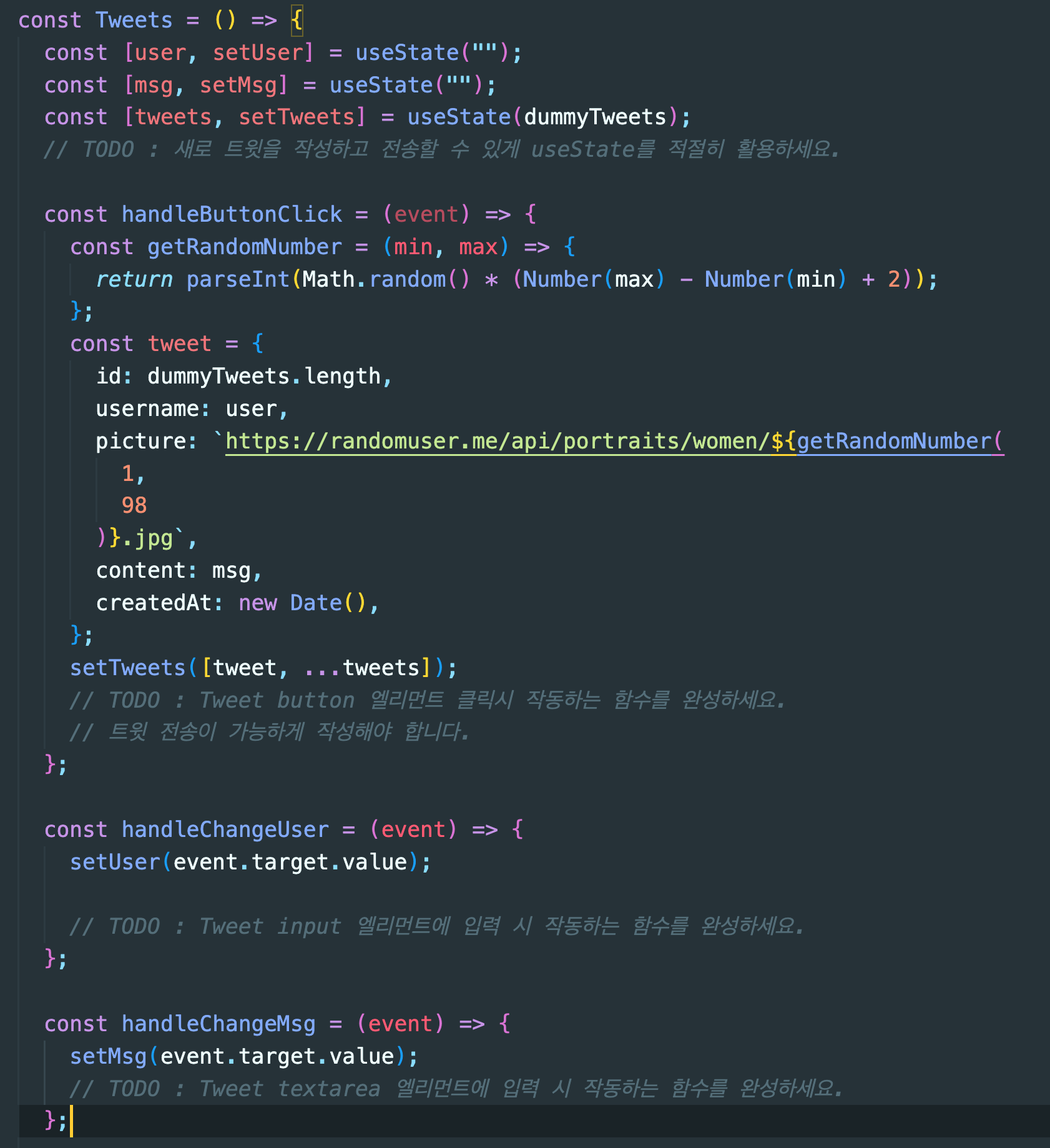 setTweets([tweet,...tweets])이 부분은 tweets를 뒤에, tweet을 앞에 넣은 배열이다. 그럼 tweets state는 tweet을 앞에 추가한 컴포넌트가 되겠지.